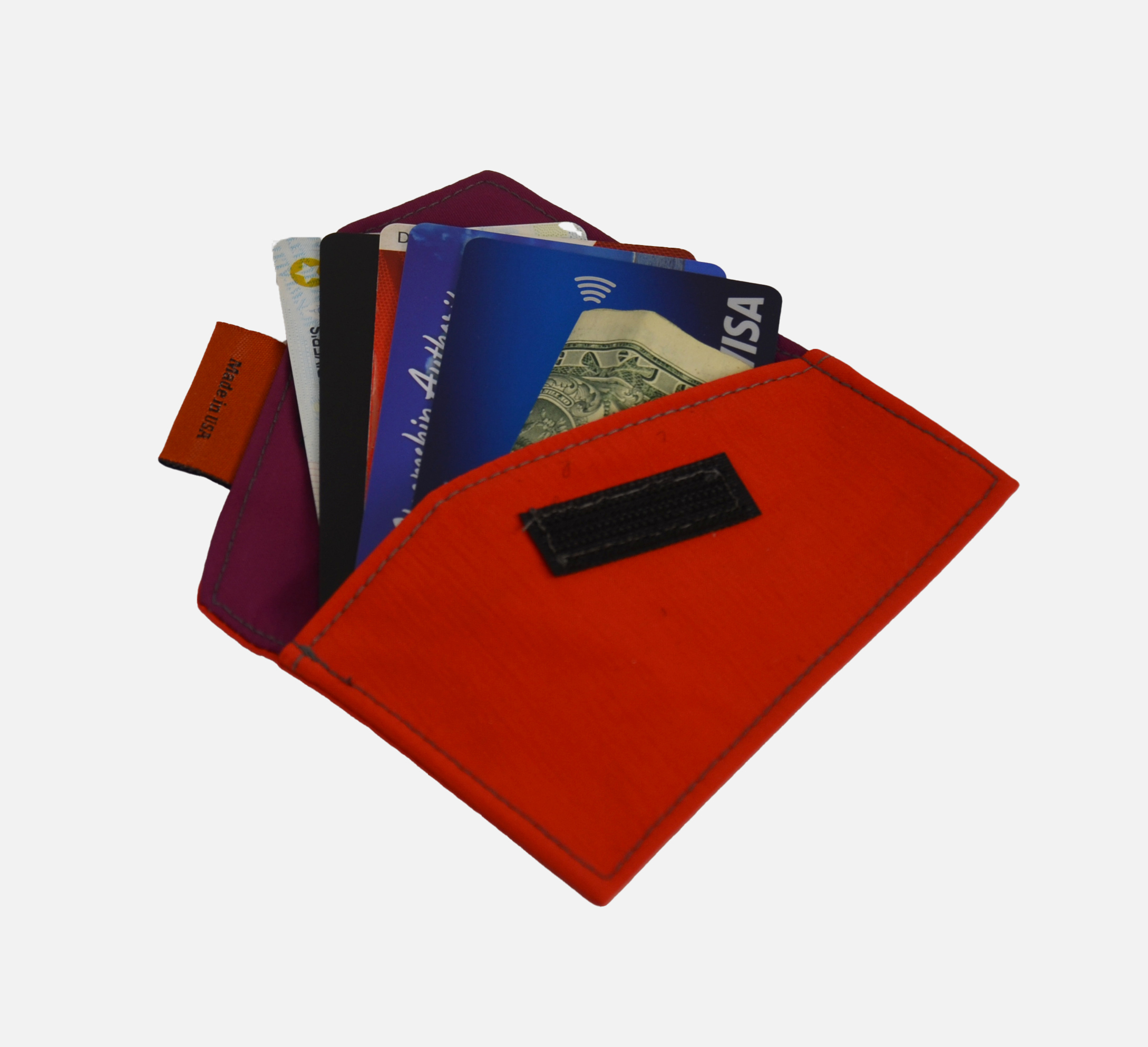 A simple card wallet to help keep your credit cards, cash and that old note from someone special chaos free. The card wallet has a Velcro closure to contain your secrets even when you are not.